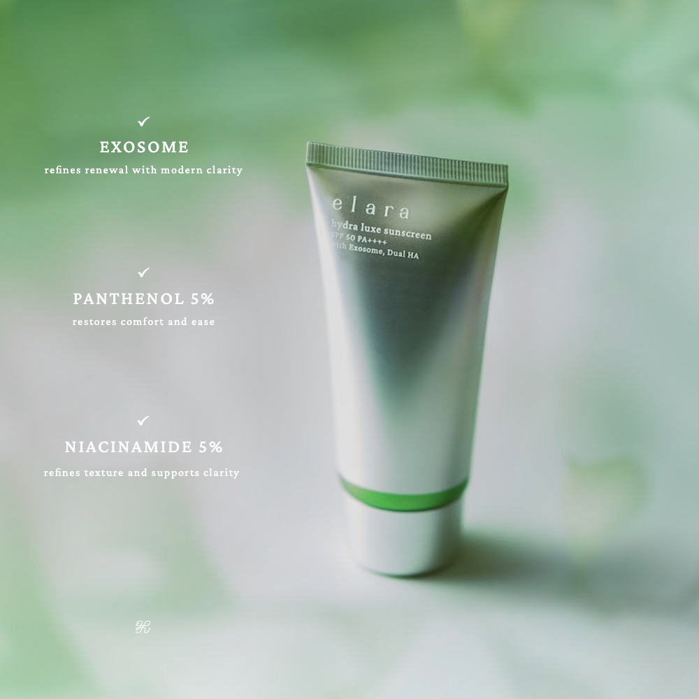 ELARA Hydra Luxe Sunscreen merupakan sediaan tabir surya yang bertekstur ringan dan mudah menyerap. Diperkaya dengan Exosome Plant, Niacinamide, Panthenol, Collagen, Hyaluronic acid, Ceramide complex, dan Peptide yang dapat membantu menenangkan kulit wajah, menghidrasi dan melembapkan kulit wajah. serta dilengkapi dnegan UV Filter yang dapat membantu melindungi kulit dari pengaruh buruk paparan sinar matahari.