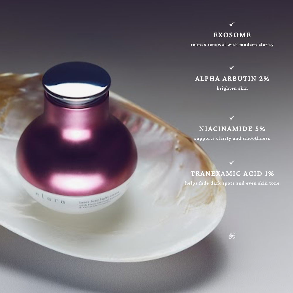 ringan dan mudah menyerap. Diperkaya dengan Exosome Plant, Niacinamide, Alpha arbutin, dan Tranexamic acid.