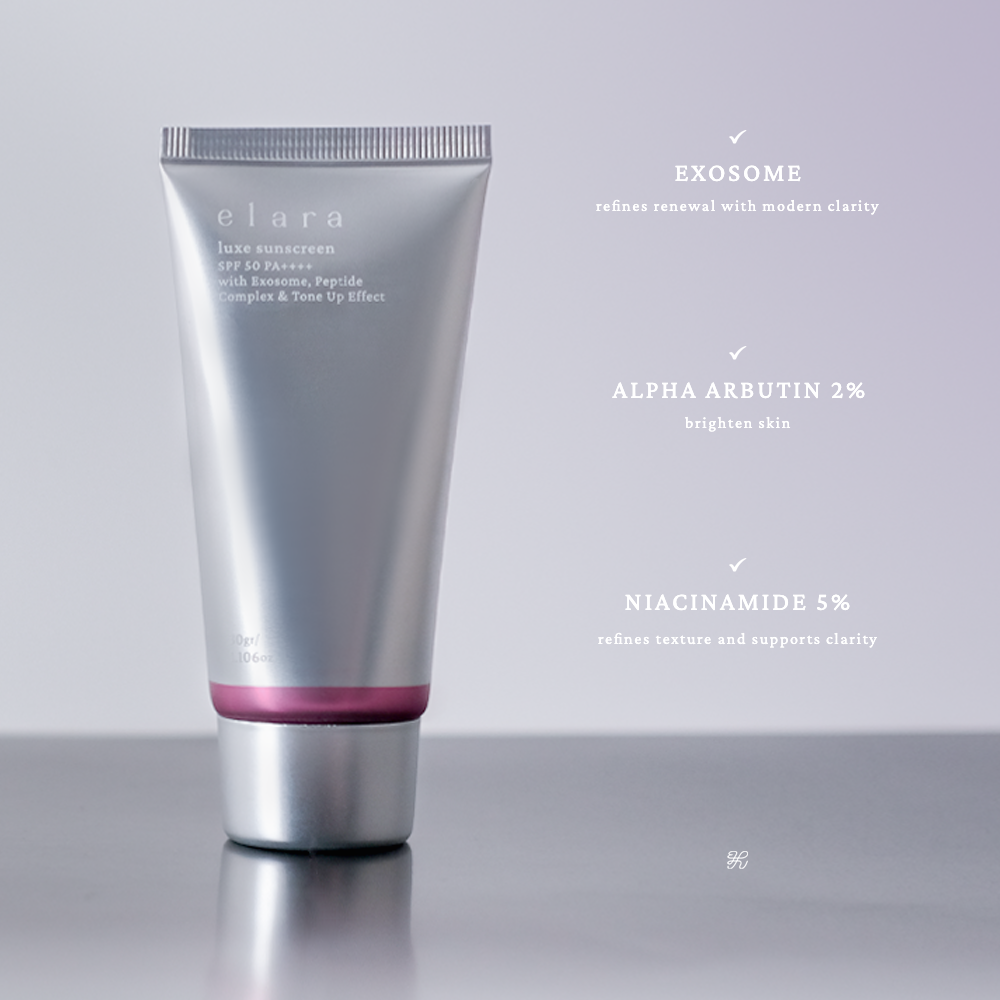 ELARA Luxe Sunscreen merupakan sediaan tabir surya yang bertekstur ringan dan mudah menyerap. Diperkaya dengan Exosome Plant, Niacinamide, Alpha arbutin, Tranexamic acid, Collagen, Ceramide complex, dan Peptide yang dapat membantu mencerahkan kulit wajah, menyamarkan noda hitam di wajah, menghidrasi dan melembapkan kulit wajah. serta dilengkapi dengan UV Filter yang dapat membantu melindungi kulit dari pengaruh buruk paparan sinar matahari.