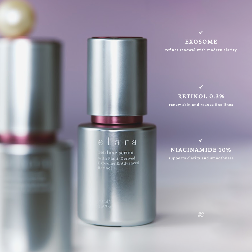 Elara RetiLuxe Serum merupakan serum yang bertekstur ringan dan mudah menyerap. Diperkaya dengan Exosome Plant, Niacinamide, Retinol, dan Peptide Complex.