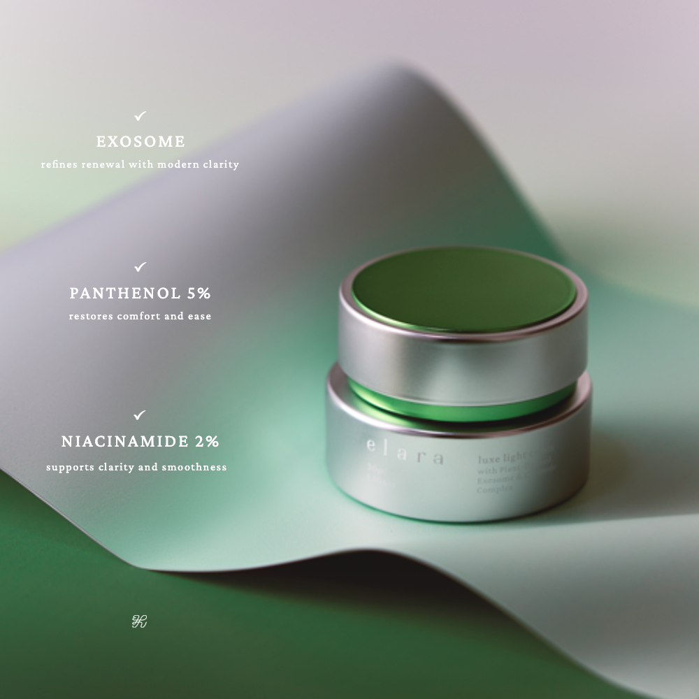 ELARA Luxe Light Cream merupakan pelembab wajah yang bertekstur ringan dan mudah menyerap. Diperkaya dengan Exosome Plant, Niacinamide, Panthenol, dan Salicylic Acid.